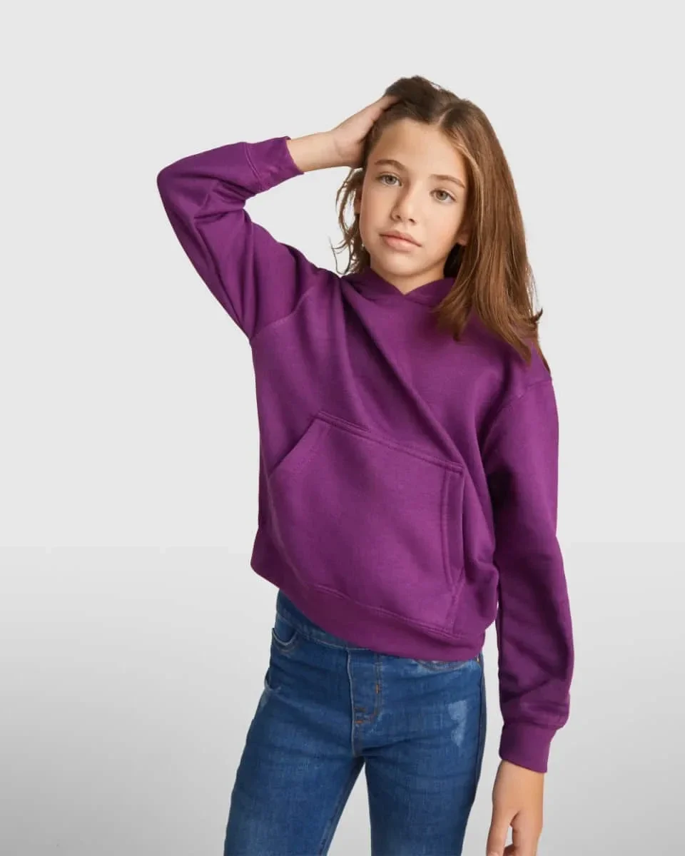 Sudadera capucha con bolsillo canguro y cordón ajustable. Puños y cinturilla de punto canalé 1×1 con elastano. Modelo de niño sin cordón.